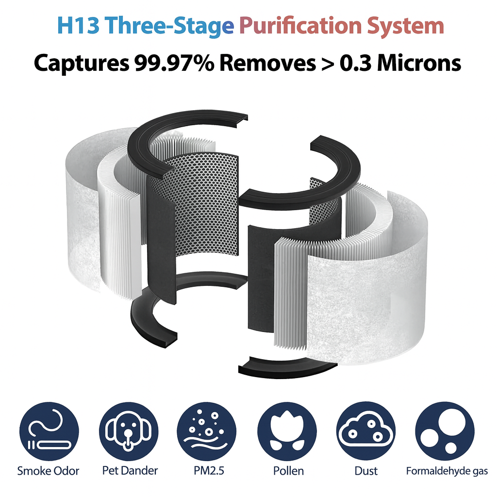 - Uses medical-grade HEPA (True HEPA) filtration, able to remove down to ~0.3 micron particles (dust, pollen, smoke, pet dander, VOCs).